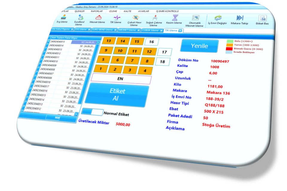 Aynı zamanda program içerisindeki izleme ekranlarından her bir makinenin, hangi yolunda hangi makaranın yüklü olduğu ve bu makaranın üzerinde kaç kg hammadde kaldığı, makine üzerindeki iş emrinin detaylı bilgileri vb. bir çok parametreye erişebilirsiniz.
